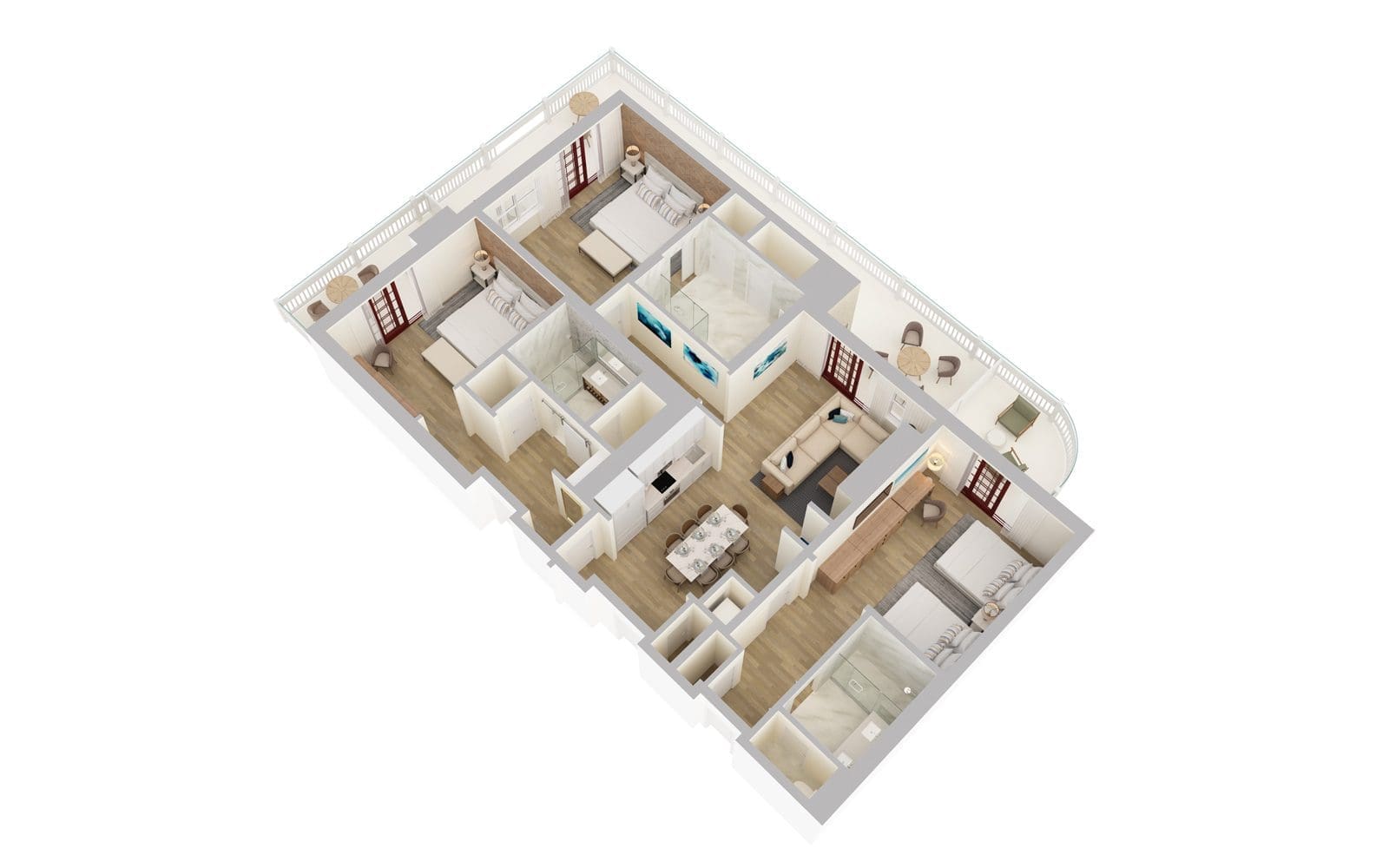 This breathtaking 3-bedroom villa with panoramic oceanfront views is the ultimate Shore House experience. Your expansive wrap-around veranda is as close as possible to the water with plush lounge seating, the perfect place to toast to the sunset.