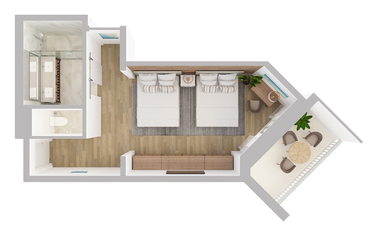 Enjoy panoramic ocean views from your private veranda, the perfect place to take in spectacular sunsets. Inside you’ll find a luxurious bedroom with either one king bed or two queen beds and a seamless stone bathroom with a walk-in shower.
