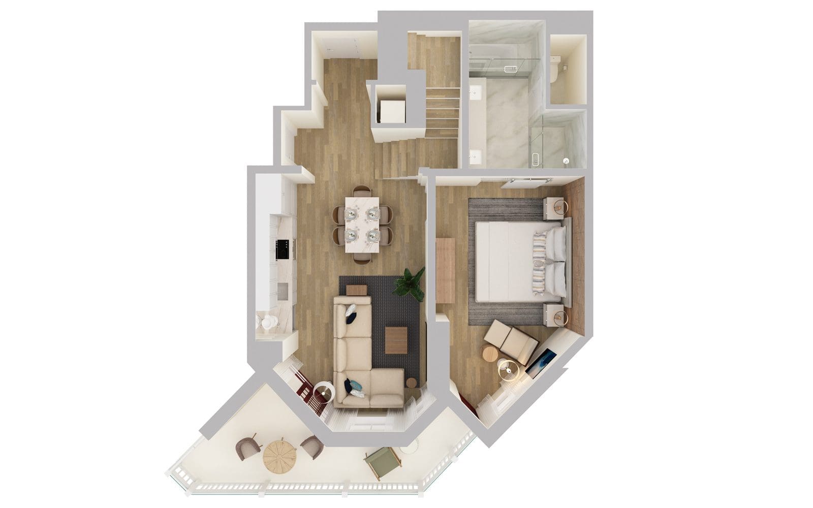Located on the first floor with a private veranda, full kitchen with island and seating, living room with fireplace and sofa bed, washer/dryer, king bedroom with access to the veranda, and stone bathroom.