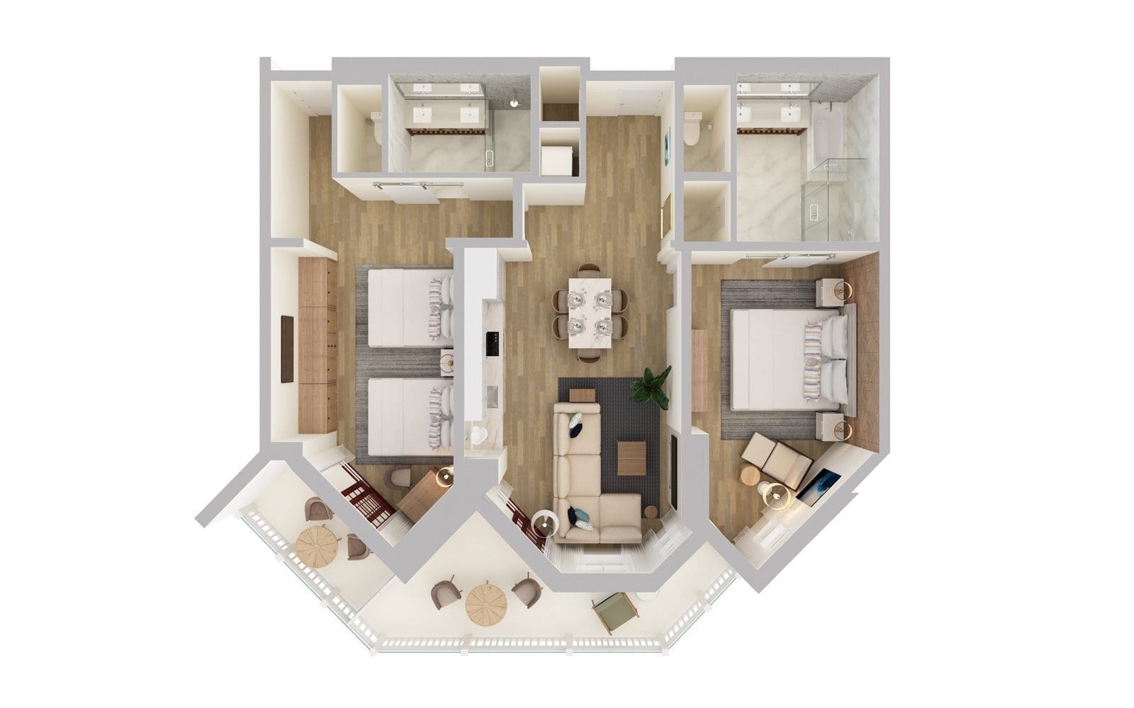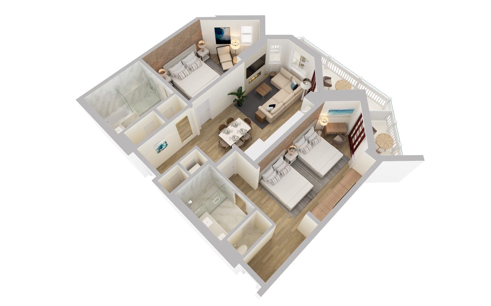 The primary bedroom offers a plush king bed and sophisticated accents, with an opulent bathroom featuring a walk-in shower, deep soaking tub, dual sink vanity, and seamless stone finishes. The second bedroom offers two queen beds and a private bathroom with a walk-in shower and dual sink vanity. Both bedrooms connect directly to the expansive veranda.