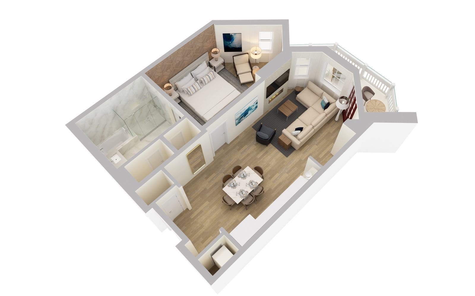 Located on the first floor with a private veranda, full kitchen with island and seating, living room with fireplace and sofa bed, washer/dryer, king bedroom with access to the veranda, and mobility accessible bathroom.