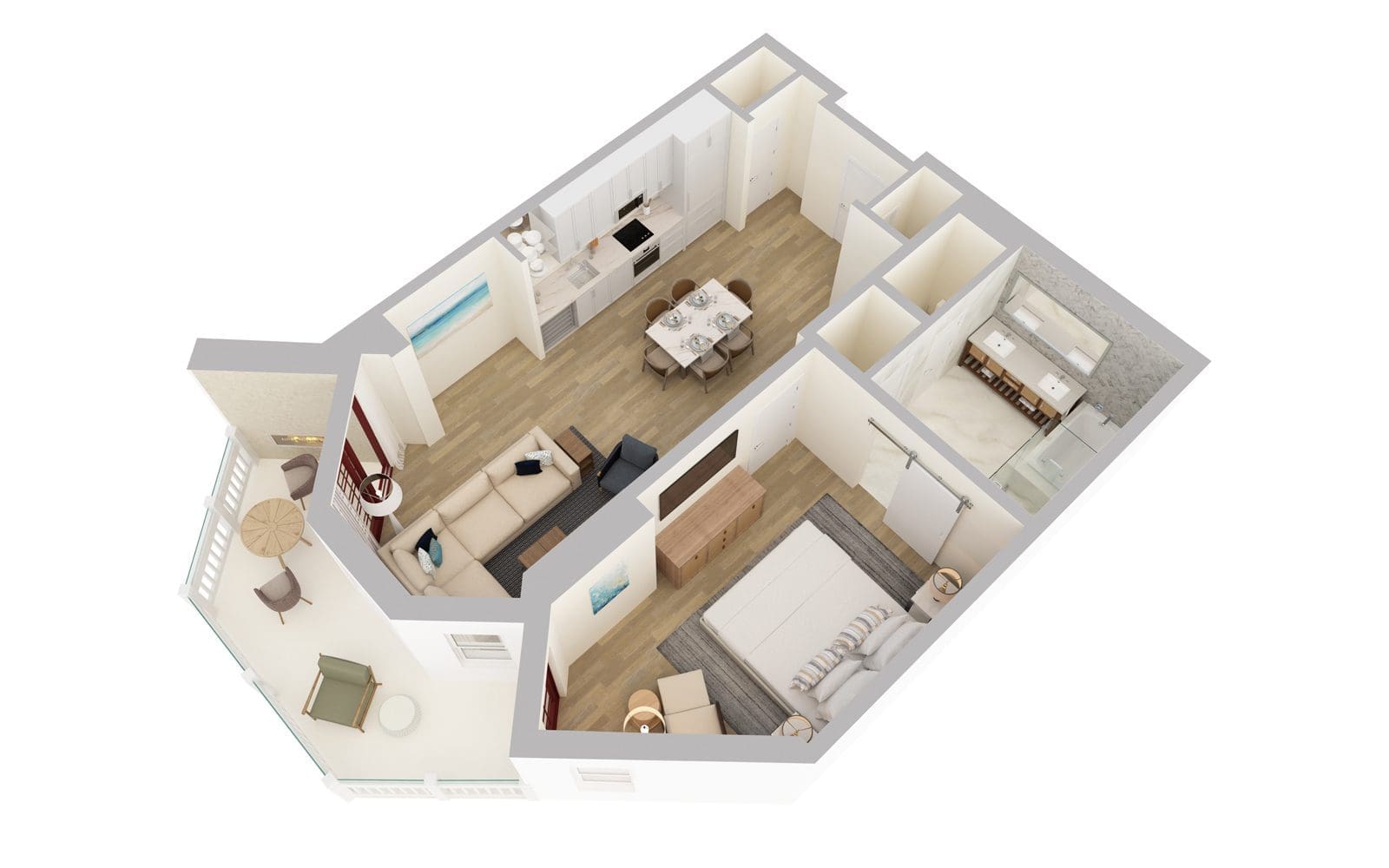 Enjoy spectacular ocean views from your private veranda with relaxed seating. Inside you’ll find a spacious open-concept beach house with all the comforts of home. Relax in the cozy living room with an L-shaped sectional, queen sofa bed and fireplace. A gourmet kitchen completes the shared space with modern appliances, a full-size refrigerator and a dining table.