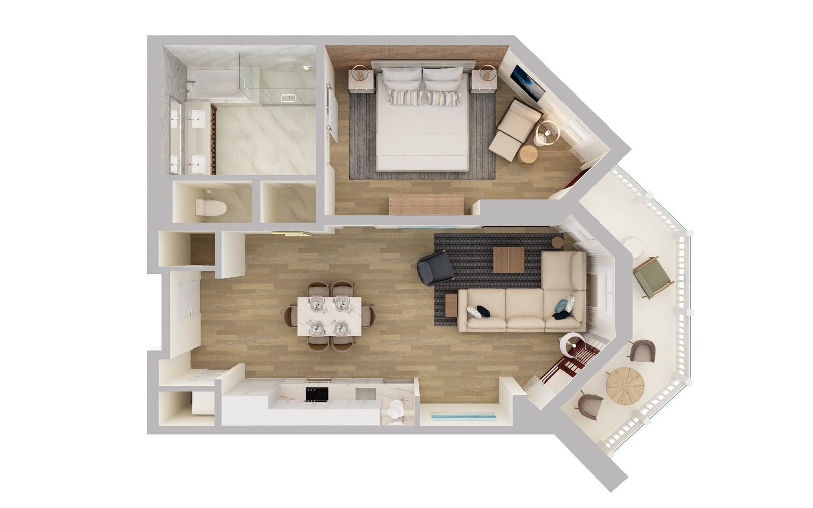 Located on the first floor with a private veranda, full kitchen with island and seating, living room with fireplace and sofa bed, washer/dryer, king bedroom with access to the veranda, and stone bathroom.