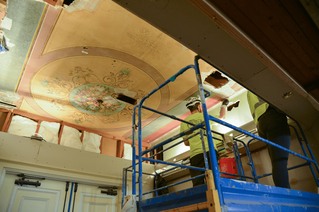 In consultation with preservation specialists, the fresco is currently being restored in place by a team of conservationists specializing in plaster and frescos. The restoration has been completed and the fresco-secco will remain in the Ocean Ballroom once the Victorian reopens to maintain its historic relationship to the building.
